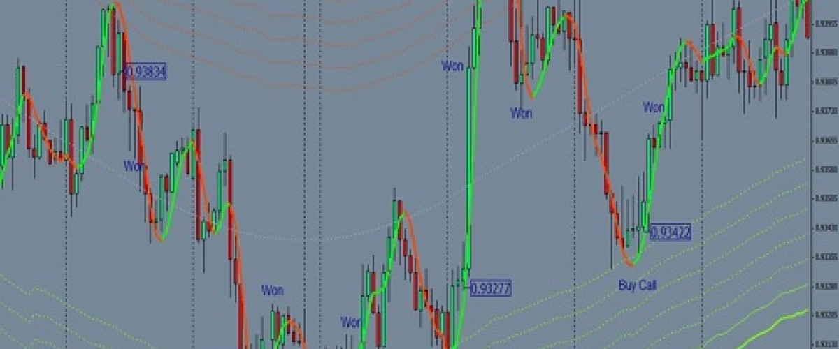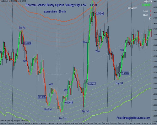 Strategi opsi biner ini adalah sistem perdagangan pembalikan berdasarkan pita TMA yang membentuk kanal dengan pita bawah (warna hijau) dan pita atas (warna merah).