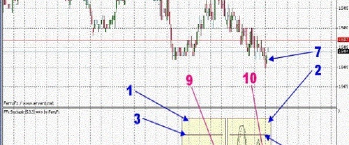 Osilator memiliki pengaturan standar untuk stokastik dengan level jenuh jual 20% (panah biru 4 dan 6) dan level jenuh beli 80% (panah biru 3 dan 5). Level ini ditunjukkan sebagai garis-garis horizontal berwarna cokelat. Jadi, mari kita pertimbangkan opsi untuk menaikkan harga pada contoh layar 1 pada pasangan mata uang GBP-USD.