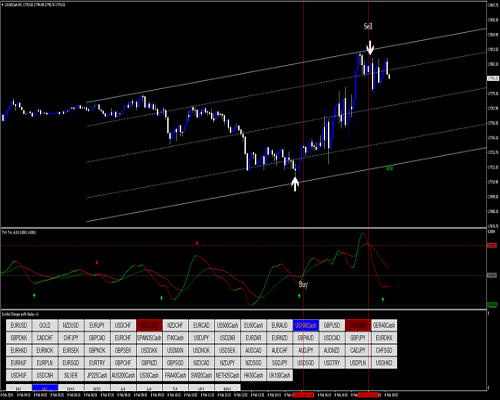 Strategi berikut ini hanya didasarkan pada dua indikator, saluran regresi dan trix. Ketika harga menyentuh sisi saluran, tunggu hingga persilangan teix masuk. Saya juga menambahkan panah zig-zag ke grafik, tetapi bisa juga dihilangkan.