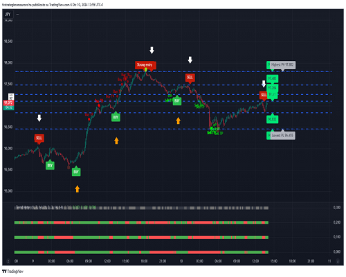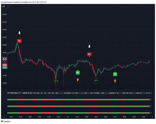 Sistem perdagangan ini menyediakan dua jenis sinyal: yang pertama, sinyal beli dan jual dasar, dan yang kedua, sinyal beli dan jual yang kuat. Keduanya difilter dan dikonfirmasi oleh pengukur tren. Namun, untuk sinyal yang kuat, konfirmasi dapat ditunda hingga 3 candle setelah sinyal dikonfirmasi.