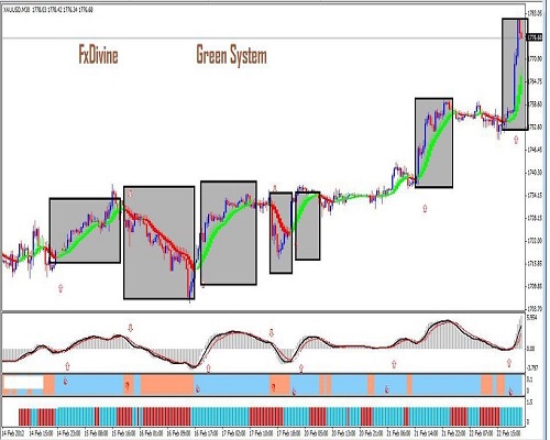 Ketika semua indikator berwarna hijau dan garis MACD memotong ke atas;