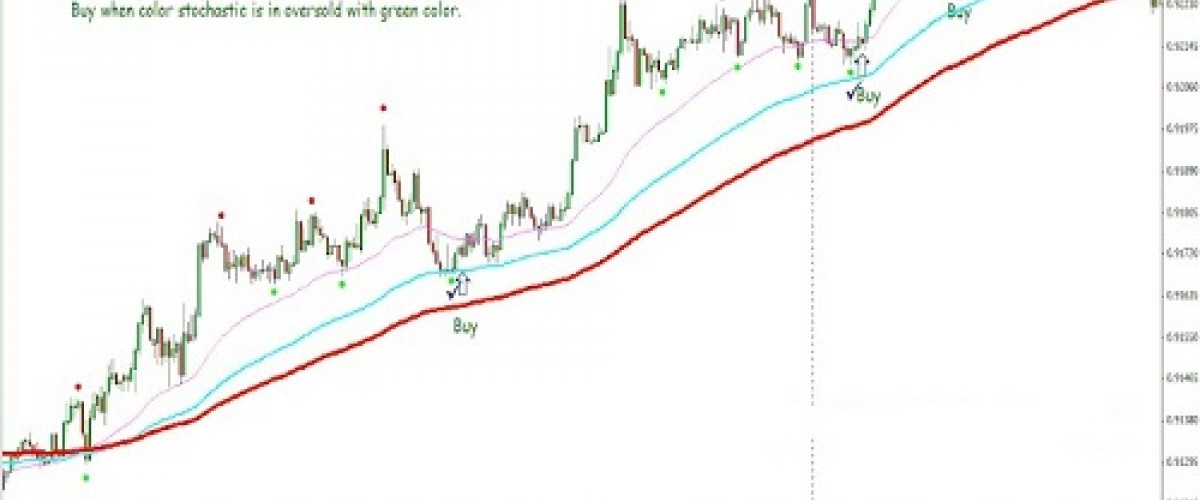 Tunggu pullback harga pada moving average yang dikonfirmasi oleh titik hijau SHI Silver Trend. Beli ketika stochastic berwarna oversold dengan warna hijau.