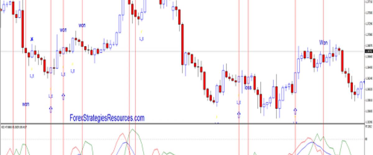 Indikator KDJ dengan garis merah di atas garis biru dan hijau.