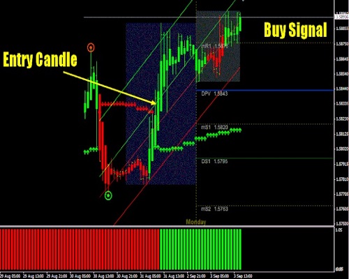 Indikator trend candle didasarkan pada stokastik dan sinyal yang disediakan adalah: Batang hijau muda