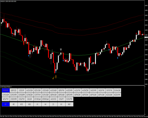 Grafik EUR/USD 1 menit menunjukkan penutupan candle saat ini di bawah pita TMA bawah.