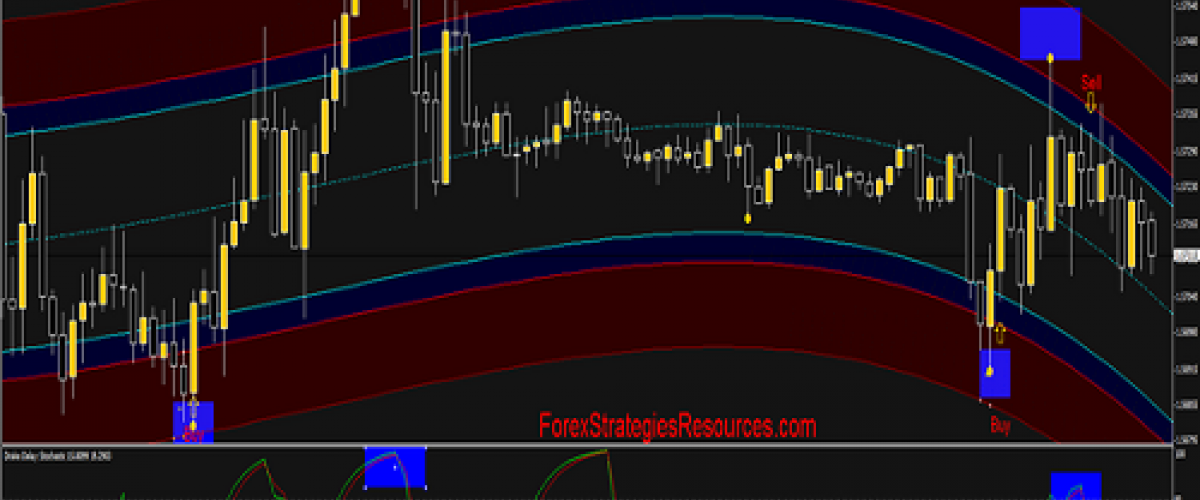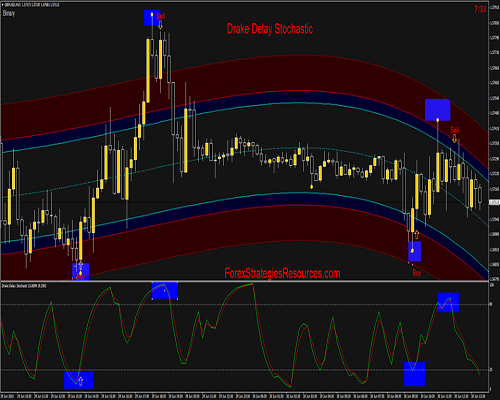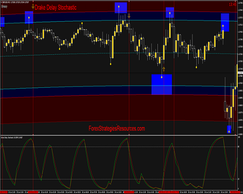 Ketika titik kuning terbentuk di pita bawah (zona merah dan biru), tunggu Drake Delay Stochastic memotong ke atas.