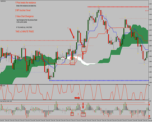 2 Minute Goldmine adalah sistem mengikuti tren berdasarkan pullback harga dan penembusan level support dan resistance. Strategi ini juga memiliki dua filter: grafik momentum Value dan Money Flow Index.