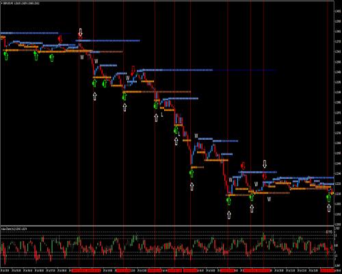 Penafsiran kedua (opsional) didasarkan pada indikator Value Chart sebagai filter. Candle dengan titik biru atau merah harus memiliki nilai Value Chart yang sesuai, sama dengan atau lebih besar dari 1,5 atau -1,5. Jika kondisi ini terjadi, sinyal tersebut valid.