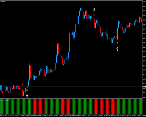 Panah beli Binary Secret dikonfirmasi oleh batang hijau dari indikator histori tren Precion.