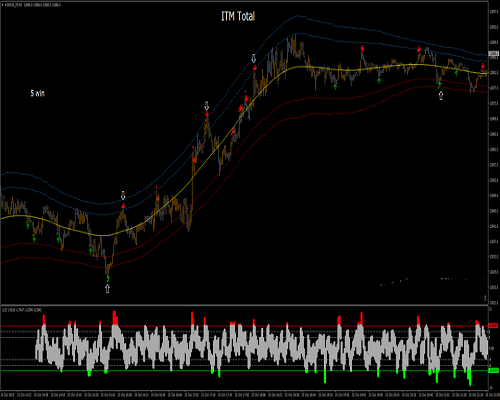 Titik hijau pada ITM Total muncul di titik terendah pada candle yang ditutup pada pita bawah pertama TMA atau di bawah pita bawah pertama atau kedua TMA. Masuki pembukaan candle berikutnya, yang bertanda panah hijau. Target harga 1-2 tick sebelum pita tengah. Stop loss di bawah swing low sebelumnya atau n poin di bawah pita TMA kedua (tergantung pada indeks atau pasangan mata uang).