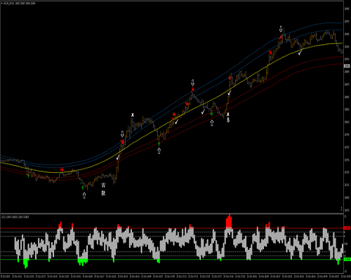 Titik merah pada ITM Total muncul di titik terendah pada candle yang ditutup pada pita atas pertama TMA atau di atas pita atas pertama atau kedua TMA. Masuki pembukaan candle berikutnya, yang bertanda panah merah. Target harga 1-2 tick sebelum pita tengah. Stop loss di atas swing high sebelumnya atau n poin di atas pita TMA kedua (tergantung pada indeks atau pasangan mata uang).