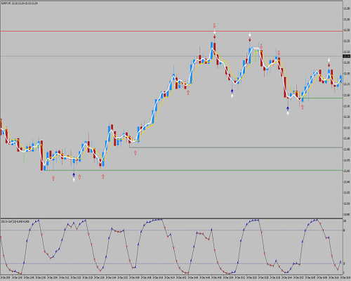 Ketika harga memantul pada support, tunggu MA Inggris melintasi rata-rata pergerakan eksponensial ke atas 3 periode dan pada saat yang sama DSS menggambar panah biru.