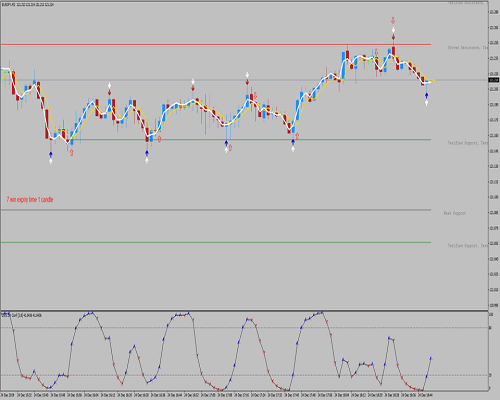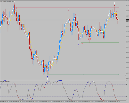 Ketika harga memantul pada resistance, tunggu MA Inggris melintasi rata-rata pergerakan eksponensial ke bawah 3 periode dan pada saat yang sama DSS menggambar panah biru.