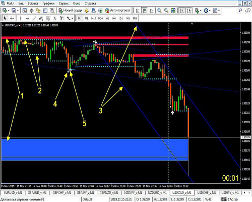 Bahasa Indonesia: Dia menempatkan sinyal awal ke titik putih (untuk itu menunjukkan panah kuning 4), di mana suara Peringatan (suara dan pesan teks). Jika kemudian lilin berikutnya muncul panah putih (di atasnya menunjukkan panah kuning 5) maka sinyal dianggap dibenarkan, dan kami mulai menyaringnya tiga filter. Indikator fxr_sr_zones_3.25 Ini menempatkan level support dan resistance yang kuat sebagai pita berwarna (mereka menggandakan panah kuning menunjuk ke 1). Indikator IOnosfera_SR ctavit level support dan resistance lokal dalam bentuk titik (untuk mereka menunjukkan panah kuning ganda 2). Indikator sliding-channels merupakan indikator saluran. Kami terutama tertarik pada 2 garis biru tebalnya (mereka menggandakan panah kuning menunjuk ke 3), yang tidak hanya menunjukkan arah tren saat ini, tetapi juga dapat berfungsi sebagai level support dan resistance.