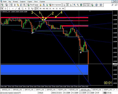ITM TOTAL menempatkan titik putih candle uplink berwarna hijau (kuning di atasnya menunjukkan panah 1). Berikutnya muncul candle berikutnya dan berada di atas panah putih (menunjuk panah kuning 2), artinya sinyal terkonfirmasi, dan kita melihat filternya. Untuk menyaring sinyal ini, pada prinsipnya, indikator IOnosfera_SR sudah cukup untuk mulai menggambar garis resistensi dalam bentuk titik-titik (yang pertama menunjukkan panah kuning 3), harga mulai rebound dari garis ke bawah, serta arah tren yang belum naik tajam. Selain itu, garis sekunder LED biru membentuk saluran geser, dari atas garis resistensi yang baru saja mendorong harga kita. Indikator ini opsional, tetapi secara visual cukup berguna. Perhatikan juga garis merah indikator resistensi fxr_sr_zones_3.25 di zona ini. Dari salah satu zona tersebut, harga kita baru saja didorong ke bawah, yang merupakan konfirmasi yang baik untuk sinyal kita. Kondisi untuk harga turun di sana, jadi ada opsi untuk mendapatkan penurunan harga dengan jangka waktu kedaluwarsa 3 menit, jika Anda bekerja pada jangka waktu M1 atau dengan jangka waktu kedaluwarsa 5 menit jika Anda bekerja pada jangka waktu M5.