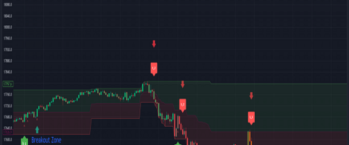 Zona breakout merah dengan panah jual di zona hijau (opsional).