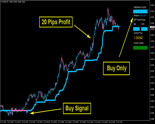 Jendela "Analisis" pada dasbor akan menampilkan "Hanya Beli" dan indikator Fibonacci Algo Scalper akan menggambar panah beli berwarna biru pada grafik. Tempatkan stop-loss di bawah swing low terbaru.