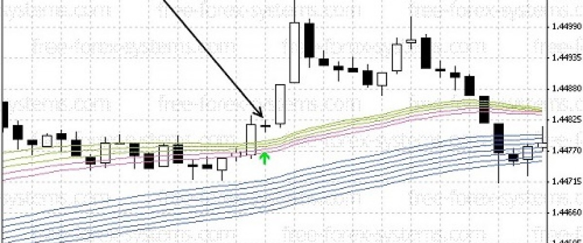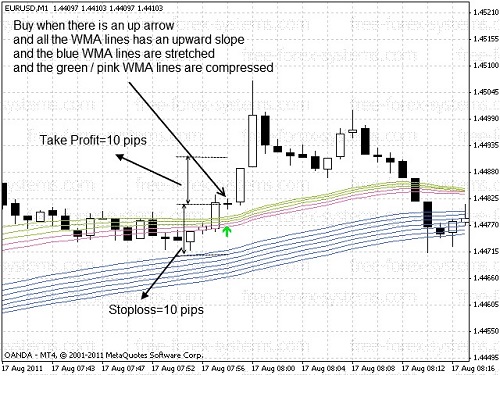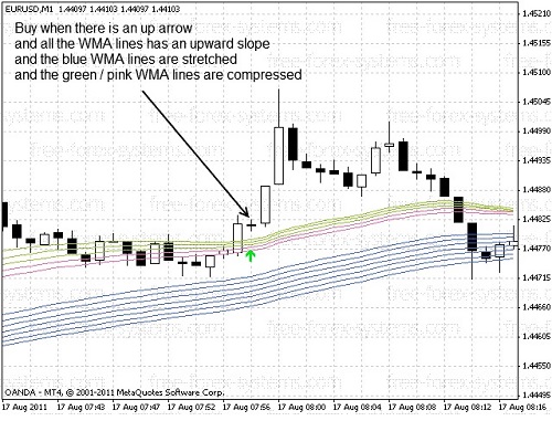 Sebaliknya, kita membuka order beli ketika terdapat panah naik, dan semua garis WMA memiliki kemiringan ke atas, dan garis WMA biru meregang dan garis WMA hijau/merah muda mengecil seperti yang ditunjukkan pada gambar berikut. Kita membuka order jual ketika terdapat panah turun, dan semua garis WMA memiliki kemiringan ke bawah, dan garis WMA biru meregang dan garis WMA hijau/merah muda mengecil.
