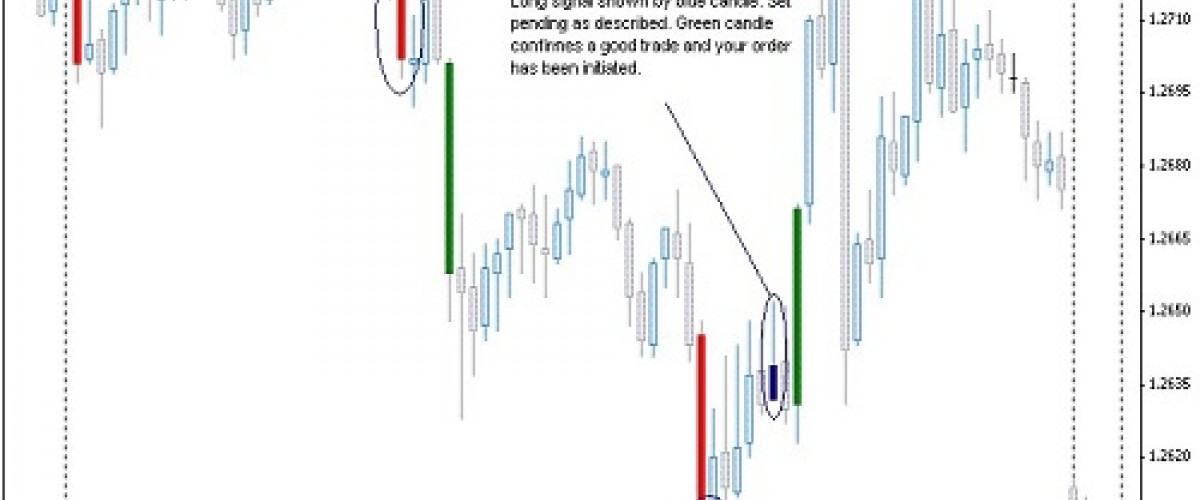 Ketika candle biru muncul, tempatkan pending order 12 pip dari titik tertinggi candle biru dan stop 10 pip di bawah candle biru serta trail stop 50 pip. Ambil profit 80% pada 20 pip dan biarkan sisanya bergerak hingga berhenti. Perhatikan bahwa candle hijau menandakan bahwa perdagangan Anda telah dimulai. Jika perdagangan Anda belum dimulai dalam 4 candle, tutup order yang tertunda dan tunggu sinyal berikutnya.