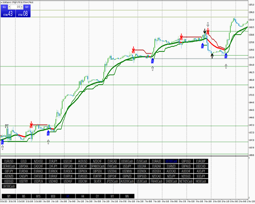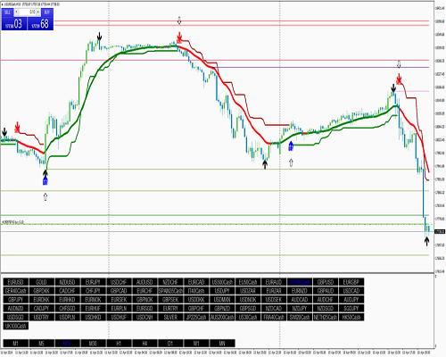 Indikator kompleks dengan Supertrend (atr 2,8, periode 18 dan MA 18).