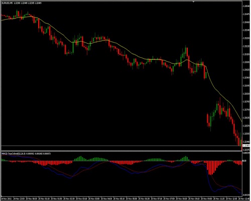 2) Tunggu harga melintasi di bawah EMA periode 20, pastikan MACD sedang dalam proses melintasi dari positif ke negatif atau telah melintasi ke wilayah negatif tidak lebih dari 5 bar yang lalu