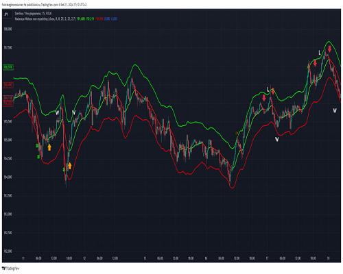 Pengaturan Long: Harga melintasi di bawah pita bawah, dan sinyal ???? muncul. Anda menunggu candle ditutup di atas garis median atau di garis hijau, lalu memasuki posisi long. Stop-loss ditetapkan pada swing low sebelumnya, dan target profit ditetapkan pada jarak yang setara dengan 1,8–2 kali risiko.