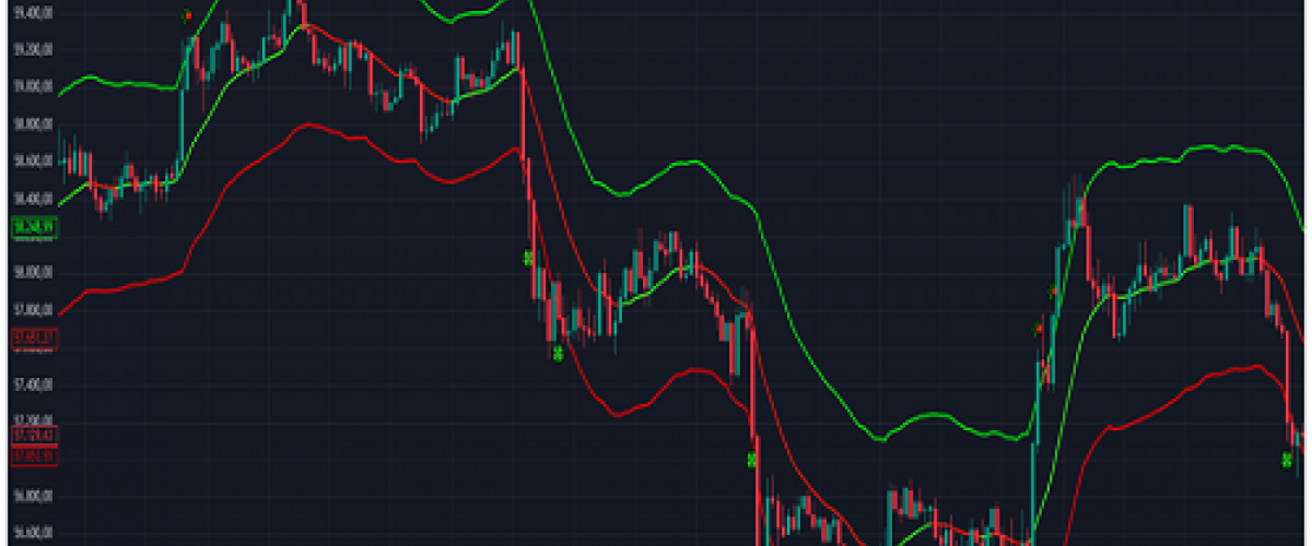Pengaturan Short: Harga melintasi di atas pita atas, dan sinyal ???? muncul. Anda menunggu candle ditutup di bawah garis median atau di garis merah, lalu memasuki posisi short. Stop-loss ditetapkan pada swing high sebelumnya, dan target profit ditetapkan pada 1,8–2 kali risiko.