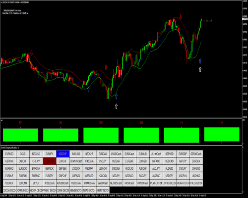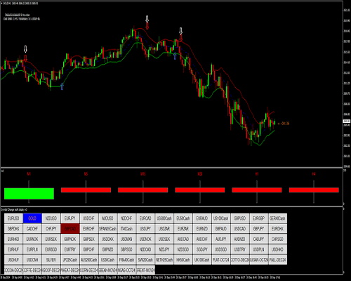 Indikator Tren Berdasarkan Beberapa Kerangka Waktu (MTF): Filter tren berdasarkan warna lilin (merah atau hijau) dari enam kerangka waktu (berkisar dari 1 menit hingga 4 jam). Lilin-lilin ini menunjukkan tren di setiap kerangka waktu, dengan warna hijau menunjukkan tren naik dan merah menunjukkan tren turun.