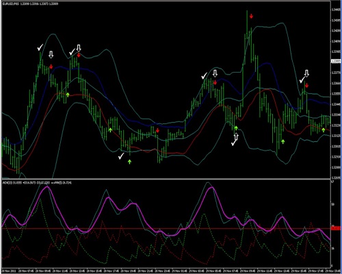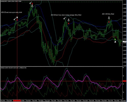 Ketika harga [naik] melampaui upper band dan upper band, tunggu panah stokastik ke bawah jika ADX/BB/MA ... ambil untung 10 pip atau pada pita tengah.