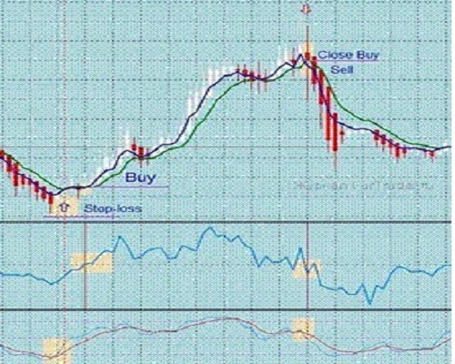 1) Exponential Moving Average (EMA) (5) dan EMA (8) bersilangan dari atas ke bawah;