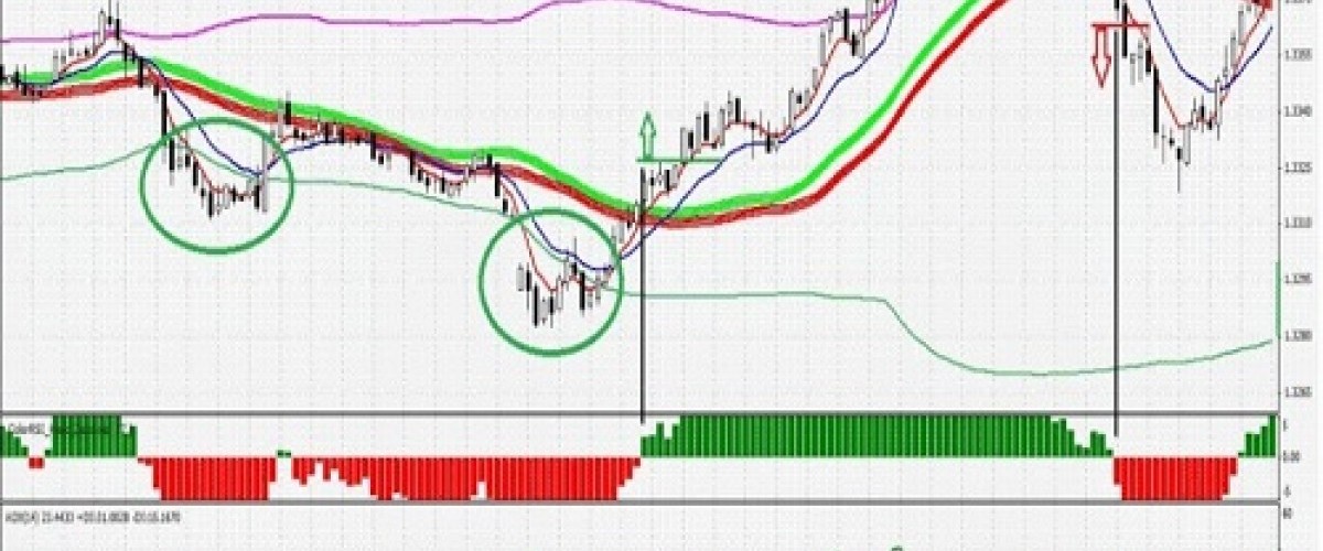 Jika band rapat hingga 50 pip, tidak ada perdagangan, karena entri saya dilakukan setelah harga menembus garis merah-hijau dengan histogram RSI yang juga berubah warna menjadi benar.