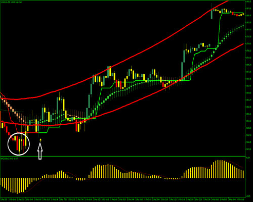 Grafik ini menunjukkan pengaturan scalping untuk Emas pada kerangka waktu yang lebih rendah (M2 atau M3)