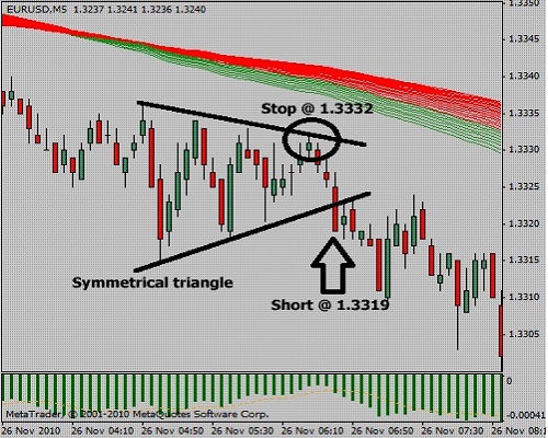 Grafik di atas mengilustrasikan cara trading pola segitiga simetris yang tepat di pasar dengan tren turun. Kita menembus posisi kecil di 1,3319 dan menempatkan stop loss 1 pip di atas swing high terbaru, yaitu 1,3332. Target kita adalah 50% ATR, atau turun 79 pip dari posisi masuk. Posisi masuk tambahan: trader agresif dapat menembus posisi kecil di sekitar garis tren turun di sekitar 1,3230.