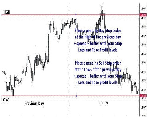 Lakukan hal yang sama untuk harga terendah hari sebelumnya dengan Sell Stop dan Buy Limit Order.
