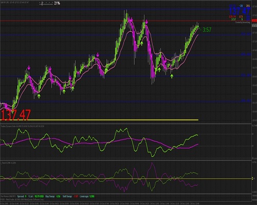Dengan Twinblade v0.1, Anda hanya perlu menunggu ASCtrend memberi peringatan dengan kotak/suara. Kemudian periksa apakah candle tersebut keluar dari moving average, periksa apakah RSI hijau melintasi garis merah muda, dan periksa apakah Itrend melintasi dan menjauhi garis 0, maka Anda memiliki potensi untuk berdagang di sana!