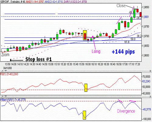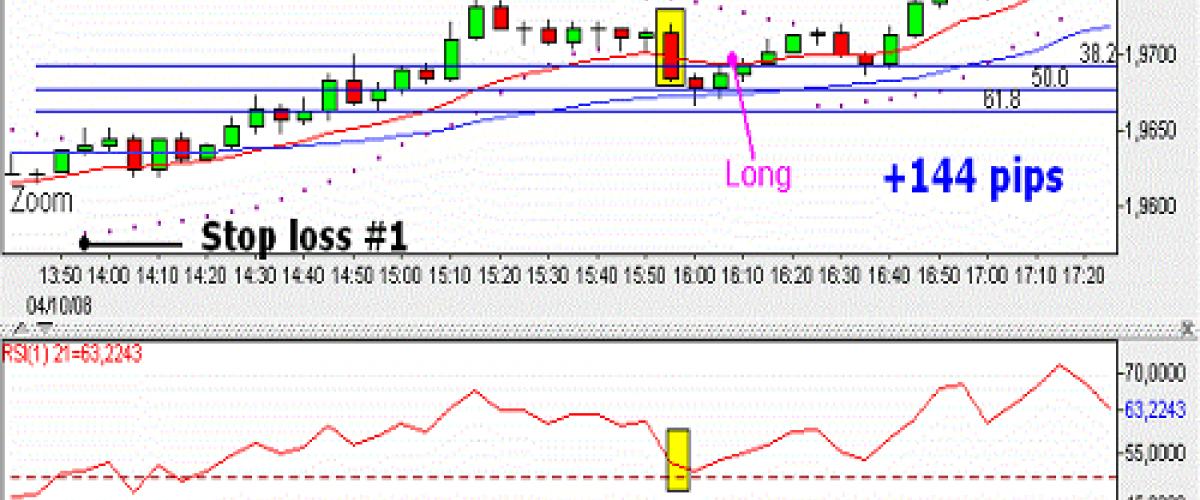 Stop loss dengan Parabolic SAR: stop loss di bawah titik SAR untuk sinyal panjang atau di atasnya untuk sinyal pendek. Kita menempatkan stop ini ketika harga memotong: