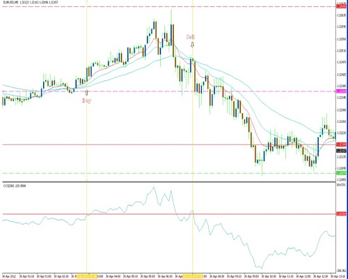Ketika EMA 10 memotong EMA 21 ke arah yang berlawanan;