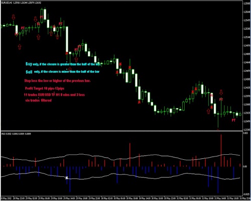 Tunggu hingga indikator sumbu berada di bawah atau menyentuh pita bawah setelah Beli pada pembukaan bar berikutnya, hanya jika penutupan lebih besar dari setengah bar.