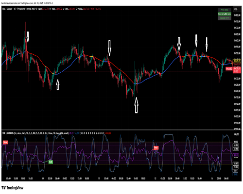 Filtered Moving Average (Merah/Biru) → mendefinisikan tren dan memberi sinyal entri (perubahan warna = sinyal).