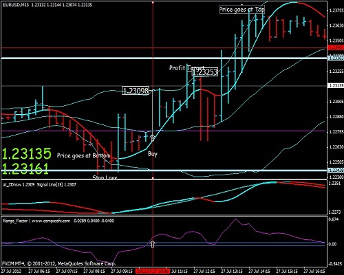 Ketika harga mencapai titik terendah atau keluar dari pita bawah, tunggu garis sinyal tren naik (aqua,at_Zdn aqua,rangefactor miring ke atas).