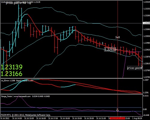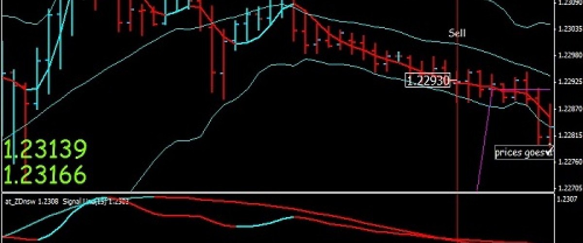 Ketika harga mencapai titik tertinggi atau keluar dari pita atas, tunggu garis sinyal tren turun (merah,at_Zdn merah,rangefactor miring ke atas).