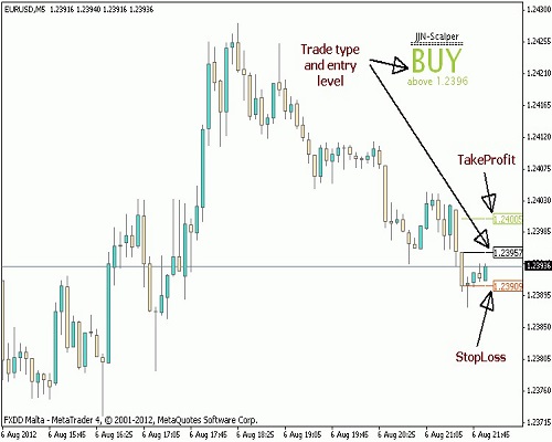 Sistem Scalper menunjukkan level masuk, take profit, dan stop loss. Gunakan pada M5 atau lebih tinggi.