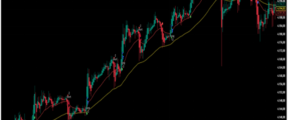 Garis kuning = EMA Lambat (65) — tren jangka panjang.