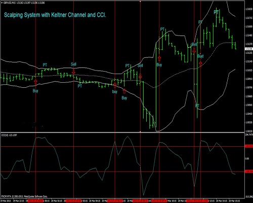 Pada gambar di bawah, Sistem Scalping dengan Saluran Keltner dan CCI sedang beraksi.