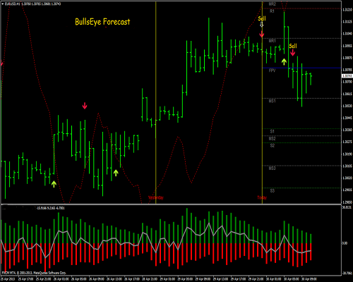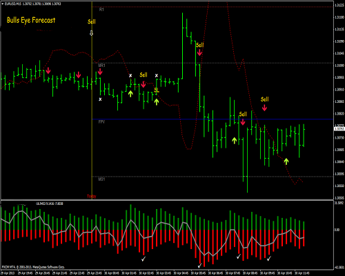 Kita akan masuk posisi jual pada sinyal panah merah. Untuk konfirmasi, kita akan memeriksa apakah rata-rata (garis abu-abu) di atas indikator kekuatan pasar sedang tren turun selama 2 bar terakhir. Dan harga berada di bawah indikator Prakiraan BullsEye.