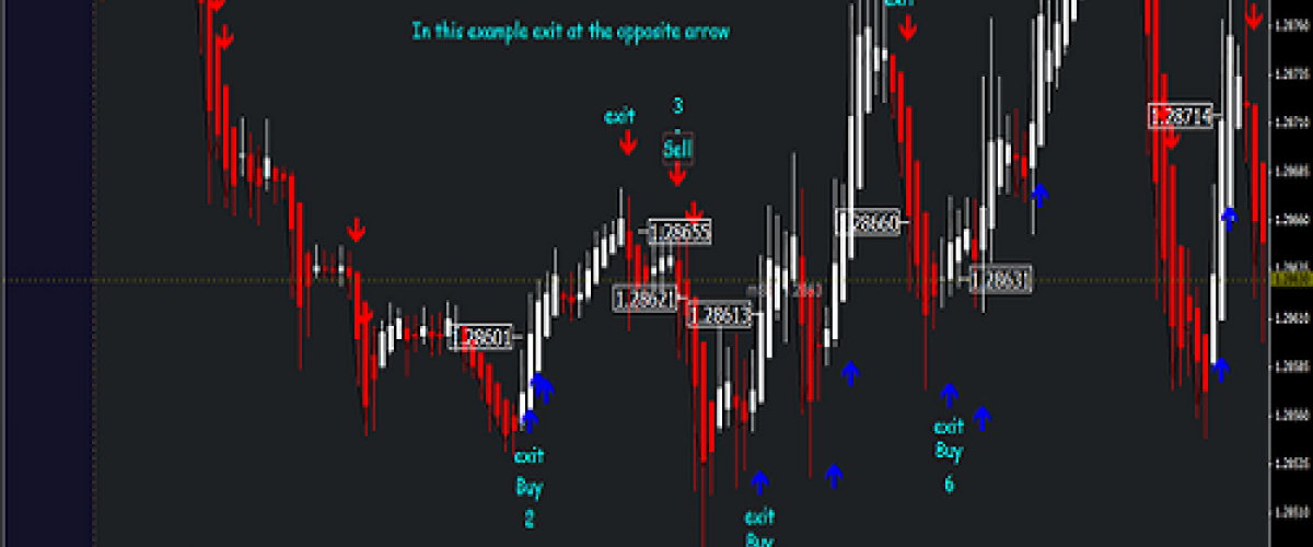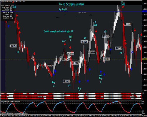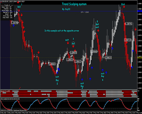 Kerangka Waktu 5 menit contoh Sistem Scalping Tren keluar dengan target keuntungan 8 pips atau pada panah berlawanan jika taret keuntungan tidak tercapai: