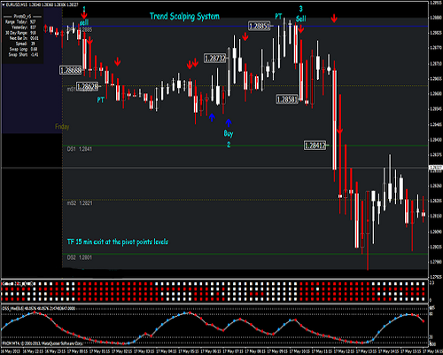 Contoh kerangka waktu 15 menit Sistem scalping tren keluar pada level titik pivot atau pada panah berlawanan i jika target tidak tercapai: