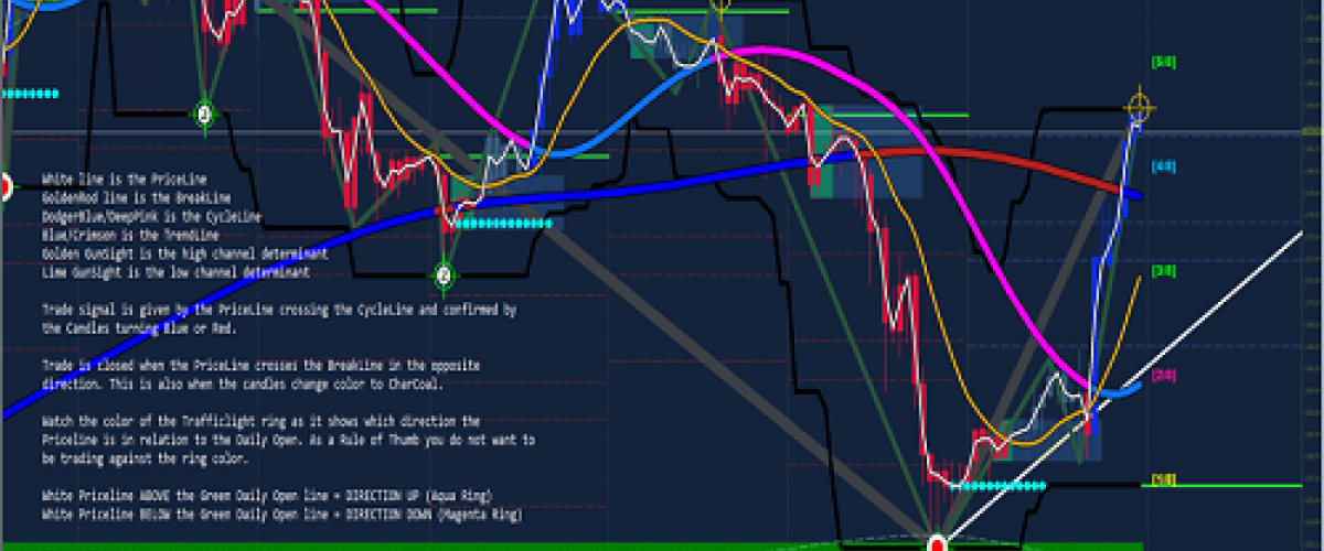 Sinyal perdagangan diberikan ketika garis harga melintasi garis siklus dan dikonfirmasi oleh candlestick yang berubah menjadi biru atau merah.