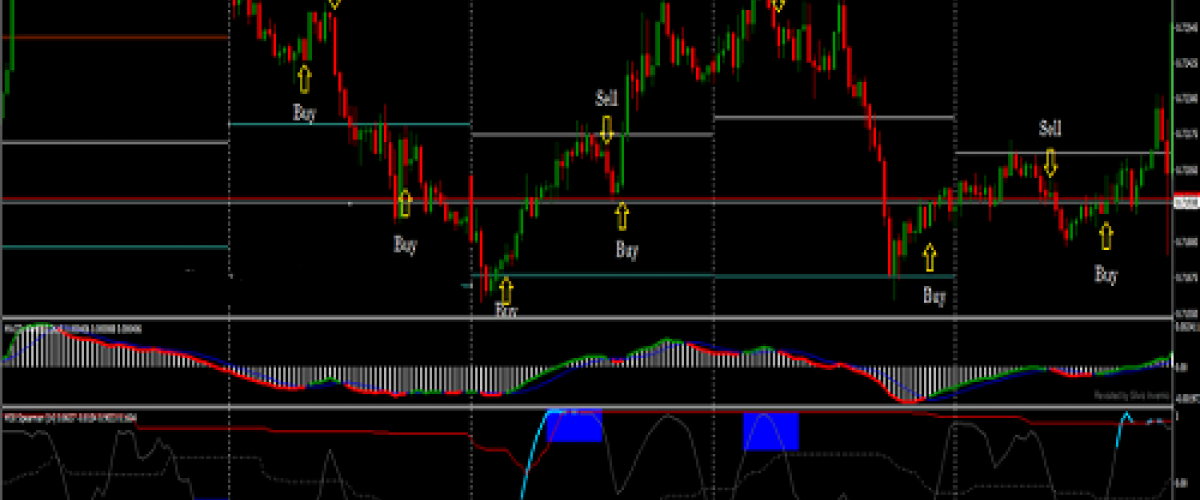Ketika harga berada di bawah batas bawah salah satu dari dua indikator dinamis dan kemudian kembali ke dalam saluran, tunggu sinyal beli pertama (atau dengan MACD alert atau dengan panah beli).