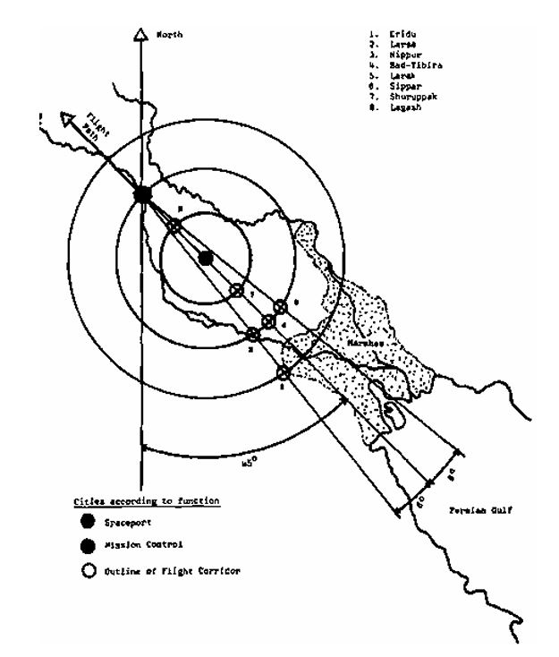 Pemilihan kota-kota awal didasarkan pada rencana matang. Bad-Tibira, Shuruppak, dan Nippur terletak pada garis 45° ke meridian Ararat, yang berpotongan di Sippar. Kota lain, Eridu dan Larsa, membentuk garis lain yang juga berpotongan di Sippar. Lagash juga terletak pada garis melingkar yang seimbang dengan pola ini, menyelesaikan jalur penerbangan pusat.